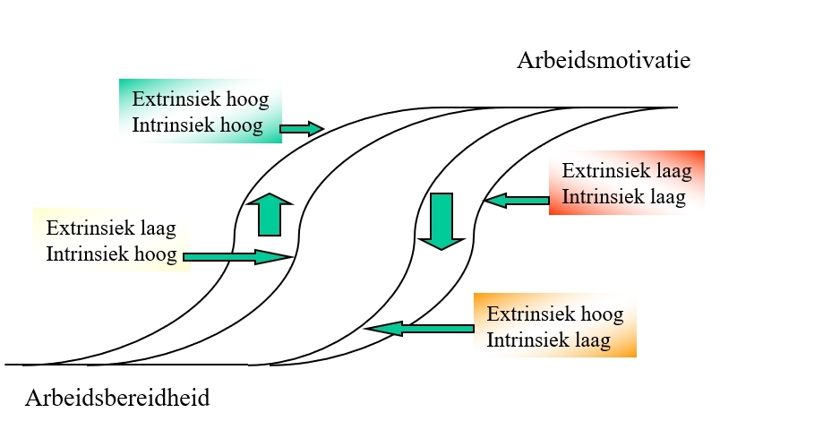 Motivatie Hysterese (Doctoraalscriptie 1996)Dit model, dat opgesteld is door ondergetekende in zijn doctoraalscriptie, Nijmegen 1996, behelst het volgende: Verhoging van de motivatie leidt niet alleen tot verbetering van de werkprestaties, hetgeen uiteraard goed is voor de organisatie, maar zorgt er tevens en impliciet voor dat de toekomst voor de organisatie veilig gesteld wordt doordat de medewerker minder snel geneigd zal zijn te zwichten voor aantrekkelijkere extrinsieke motivatoren geboden door andere werkgevers.Anders gezegd, als iemand intrinsiek niet goed beloond wordt, let hem niets meer om in te gaan op aanbiedingen elders waar dat wel gebeurt en zelfs op aanbiedingen waar dan tenminste de extrinsieke beloning beter is. In het als klassiek te beschouwen werk van Herzberg (1968) wordt dit fenomeen omschreven als 'satisfiers en dis-satisfiers'. Een mogelijke weergave van dit verschijnsel is een (dubbele) hysterese vorm: